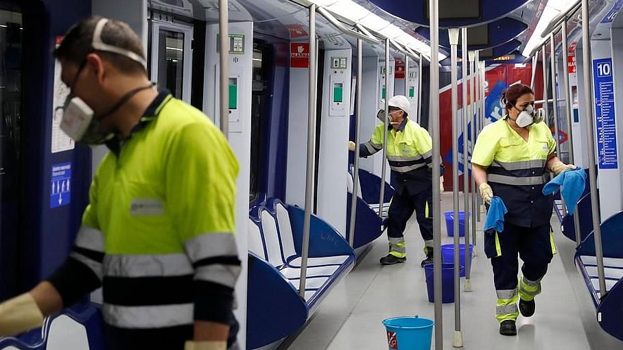 Noida Metro Rail Corporation is undertaking sanitization of metro stations as a precautionary measure to contain Coronavirus. Visuals from Noida Sector 50 station.
