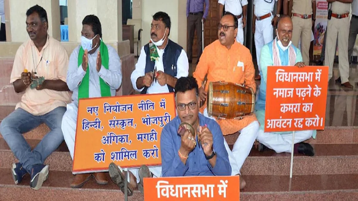 Before the start of the day, BJP MLAs sat on the stairs at the entrance of the assembly and chanted Hanuman Chalisa while Deoghar MLA Narayan Das wore a garland made of 'belpatra'.