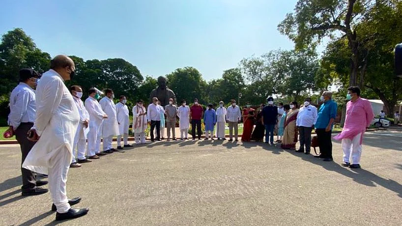 Congress leader Jairam Ramesh tweeted: "All MPs of the Congress and like-minded parties are marching from the Gandhi statue to the Ambedkar statue in Parliament to protest against anti-farmers and anti-workers Bills rubber-stamped in Parliament in the most undemocratic manner by the Modi government."