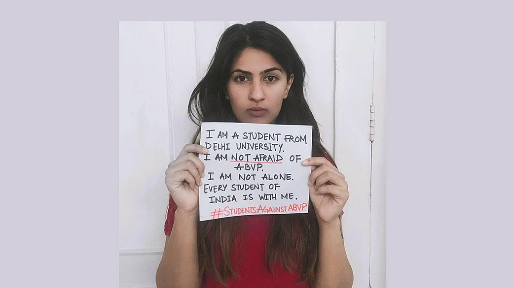 Gurmehar Kaur, daughter of Kargil martyr Captain Mandeep Singh, changed her Facebook profile picture holding a placard which read "I am a student from Delhi University. I am not afraid of ABVP. I am not alone. Every student of India is with me. #StudentsAgainstABVP".